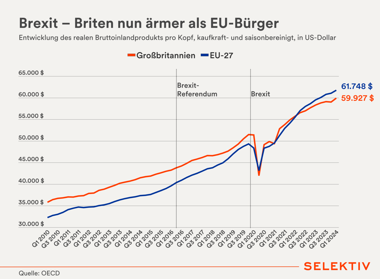 Brexit. Der britische Ex-Premier Boris Johnson lobte am diesjährigen „Salzburg Summit“ der Industriellenvereinigung den Brexit. Betonte aber gleichzeitig, dass er nicht generell für einen Austritt aus der EU werbe – Österreich habe ganz andere Voraussetzungen, so Johnson. Er wies auf den guten Außenhandel mit der EU und Österreich hin. Tatsächlich sind die britischen Exporte 2023 gestiegen, getrieben durch Dienstleistungsexporte. Warenexporte in die EU sanken 2023 nominell um 5,9 Prozent. Das britische Office for Budget Responsibility (OBR) geht davon aus, dass der Brexit das Wirtschaftswachstum langfristig um vier Prozent bremst und Importe und Exporte um 15 Prozent geringer ausfallen. Im ersten Quartal 2024 wuchs das britische BIP um 0,6 Prozent (Gesamtjahr 2023: 0,1 Prozent). Laut OECD verzeichnete ein Brite 2016 vor dem Brexit-Referendum noch ein knapp 3.000 US-Dollar größeres BIP pro Kopf als ein EU-Bürger. Im Jahr 2024 ist nunmehr ein EU-Bürger um mehr als 1.500 US-Dollar reicher. [Quellen: OBR; brit. Statistikamt, OECD]