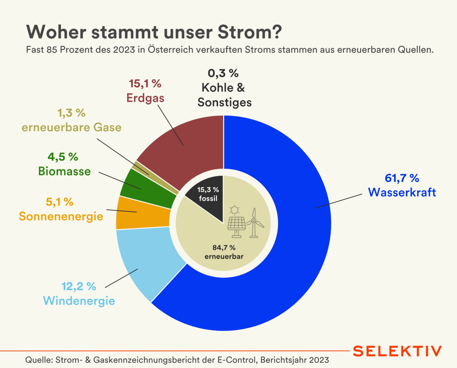 Grafik (von Stephan Frank): Im Vorjahr wurden 85 Prozent des in Österreich verkauften Stroms mit Herkunftsnachweisen (HKN) aus erneuerbaren Quellen belegt (2022: 83 Prozent). Der Großteil der in Österreich eingesetzten HKN stammt mit knapp 62 Prozent aus Wasserkraft. Stromlieferanten sind verpflichtet, die Herkunft von Energielieferungen offenzulegen – HKN können aber getrennt vom Strom selbst gehandelt werden, auch Österreich exportiert HKN. [Quelle: E-Control-Bericht]