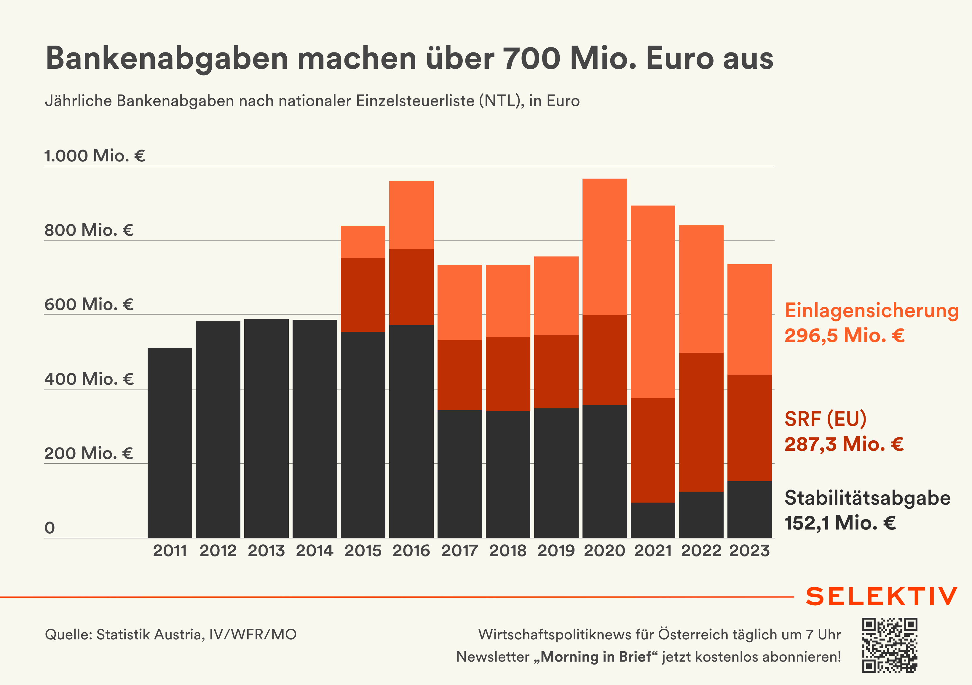 Grafik (von Christoph Hofer): Knapp 150 Mio. Euro mussten heimische Banken 2023 über die Bankenabgabe (offiziell: „Stabilitätsabgabe“) an den Staat abliefern. Die 2010 eingeführte und ab 2017 sukzessive reduzierte Abgabe ist jedoch nicht die einzige ihrer Art. Daneben müssen Banken Zahlungen an den Einlagensicherungsfonds (2023: 296,5 Mio. Euro) sowie den Single Resolution Fund der EU (2023: 287,3 Mio. Euro) leisten. Die Gesamtsumme der von Banken zu zahlenden Abgaben betrug 2023 rund 736 Mio. Euro. [Quellen: Statistik Austria, OeNB, European Banking Authority, Single Resolution Mechanism]