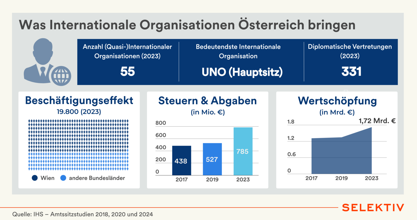 Grafik: Kaum in einem anderen Land haben so viele internationale Organisationen ihren Sitz wie in Österreich. Rund 50 internationale Organisationen sind hier angesiedelt und damit auch ein spürbarer Wirtschaftsfaktor. Die gesamte jährliche Wertschöpfung des Sektors betrug laut einer Studie des Wifo 2023 rund 1,7 Mrd. Euro – ein Viertel mehr als in der Vorgängerstudie 2020. Rund 20.000 Arbeitsplätze werden durch die Organisationen gesichert, zu denen auch diplomatische Vertretungen und internationale Schulen zählen. 67 Prozent der Wertschöpfungseffekte entfallen auf Wien.