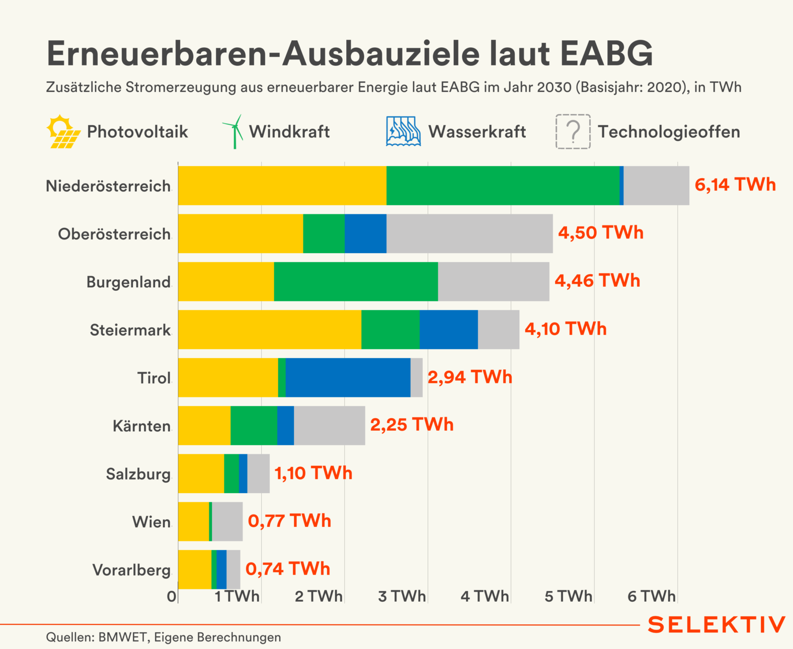 💡 Wie die Bundesländer Erneuerbare ausbauen müssen. Das vergangene Woche präsentierte Erneuerbaren-Ausbau-Beschleunigungs-Gesetz (EABG) regelt u. a. wie die bis zum Jahr 2030 nötige zusätzliche erneuerbare Stromerzeugung von 27 Terawattstunden (TWh) erreicht werden soll. Rund drei Viertel des Ausbaus werden technologisch vorgegeben, den Rest können die Bundesländer selbst festlegen. Am wenigsten Spielraum hat Tirol, die größte Flexibilität wird Oberösterreich eingeräumt. Für den Beschluss des Gesetzes benötigt die Regierung eine Zweidrittelmehrheit im Nationalrat. Grünen-Chefin Leonore Gewessler fordert „deutliche Nachbesserungen“, die im Gesetz vorgesehenen Sanktionen für säumige Bundesländer bezeichnet sie als „schlechten Witz“. Weiters braucht es für Gewessler verbindliche Ziele auch über das Jahr 2030 hinaus sowie Maßnahmen wie etwa eine PV-Pflicht bei Flächenversiegelung, z. B. bei Parkplätzen. [Quellen: Regierungsvorlage, Pressekonferenz, BMWET, Ö1/Gewessler | Grafik von Christoph Hofer]