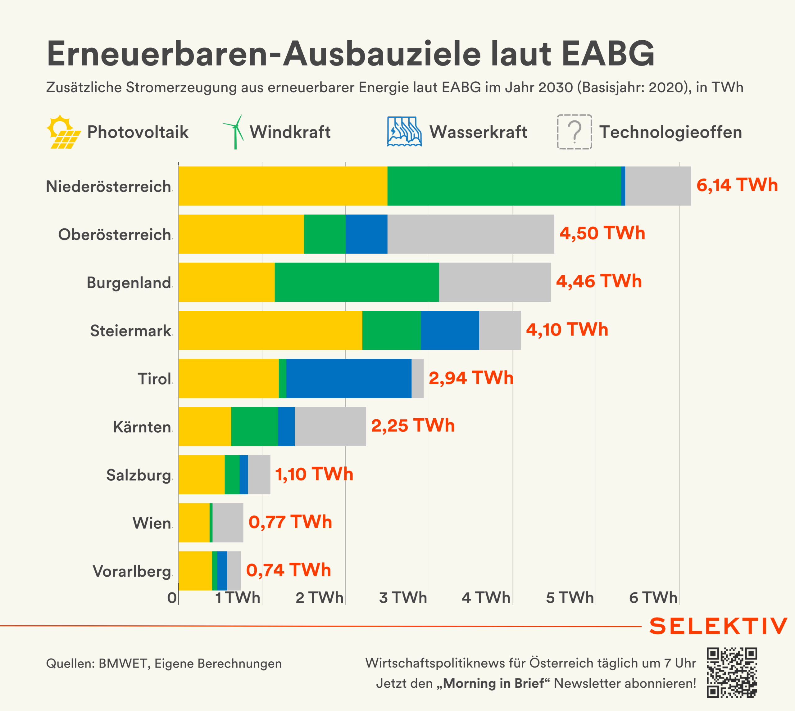 💡 Wie die Bundesländer Erneuerbare ausbauen müssen. Das vergangene Woche präsentierte Erneuerbaren-Ausbau-Beschleunigungs-Gesetz (EABG) regelt u. a. wie die bis zum Jahr 2030 nötige zusätzliche erneuerbare Stromerzeugung von 27 Terawattstunden (TWh) erreicht werden soll. Rund drei Viertel des Ausbaus werden technologisch vorgegeben, den Rest können die Bundesländer selbst festlegen. Am wenigsten Spielraum hat Tirol, die größte Flexibilität wird Oberösterreich eingeräumt. Für den Beschluss des Gesetzes benötigt die Regierung eine Zweidrittelmehrheit im Nationalrat. Grünen-Chefin Leonore Gewessler fordert „deutliche Nachbesserungen“, die im Gesetz vorgesehenen Sanktionen für säumige Bundesländer bezeichnet sie als „schlechten Witz“. Weiters braucht es für Gewessler verbindliche Ziele auch über das Jahr 2030 hinaus sowie Maßnahmen wie etwa eine PV-Pflicht bei Flächenversiegelung, z. B. bei Parkplätzen. [Quellen: Regierungsvorlage, Pressekonferenz, BMWET, Ö1/Gewessler | Grafik von Christoph Hofer]