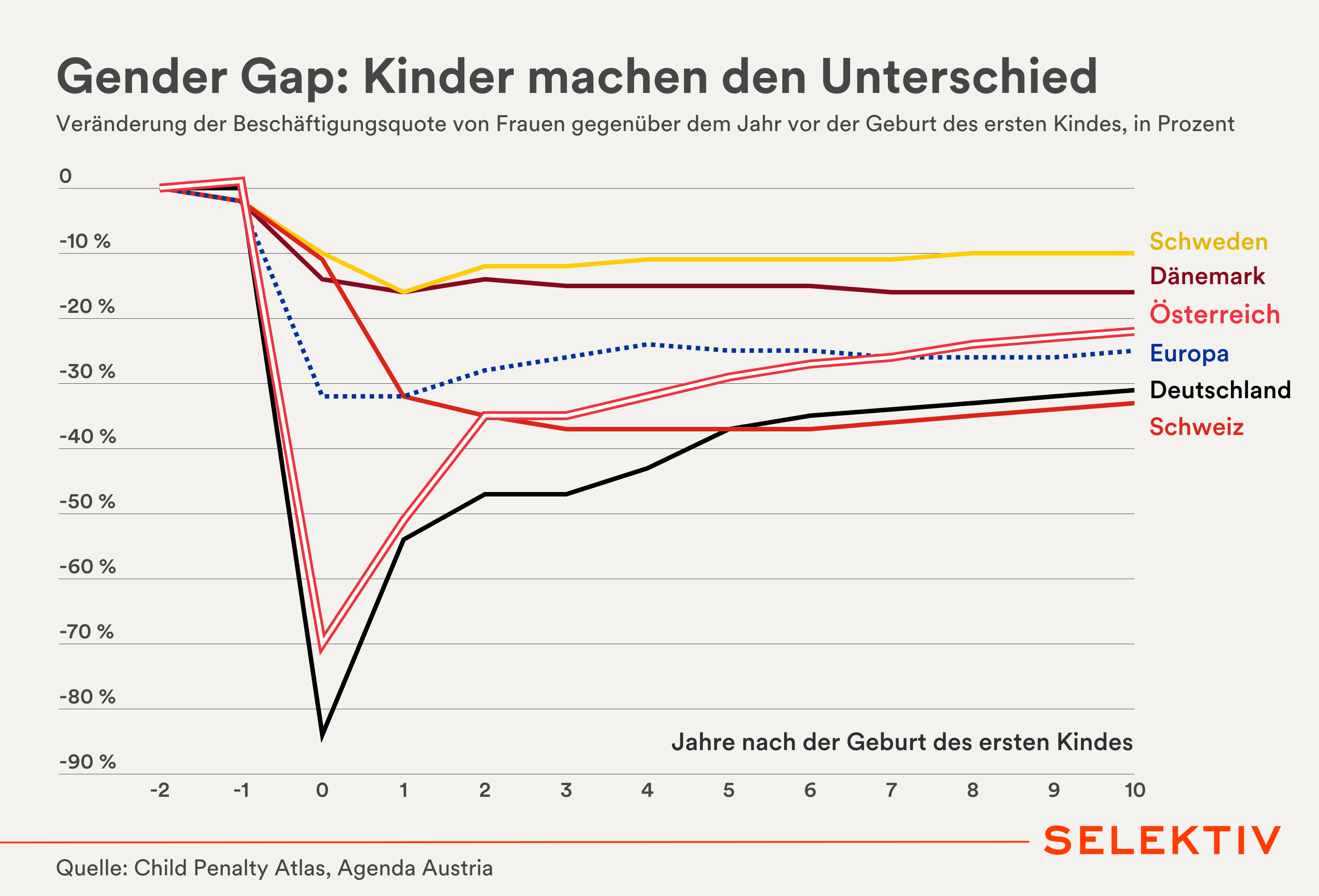Grafik (von Stephan Frank): Die Geburt des ersten Kindes reduziert die Beschäftigungsquote von Frauen gegenüber Männern deutlich. Österreich liegt hierbei hinter Vorzeigenationen wie Schweden oder Dänemark und erst ab einem Alter von 7 Jahren knapp über dem Europaschnitt. Der Einbruch der Beschäftigung im ersten Jahr nach der Geburt ist besonders in Österreich (-70 Prozent) und Deutschland (-84 Prozent) sehr stark und erholt sich selbst nach 10 Jahren nur auf -22 Prozent bzw. -31 Prozent. [Quellen: Child Penalty Atlas, Agenda Austria]