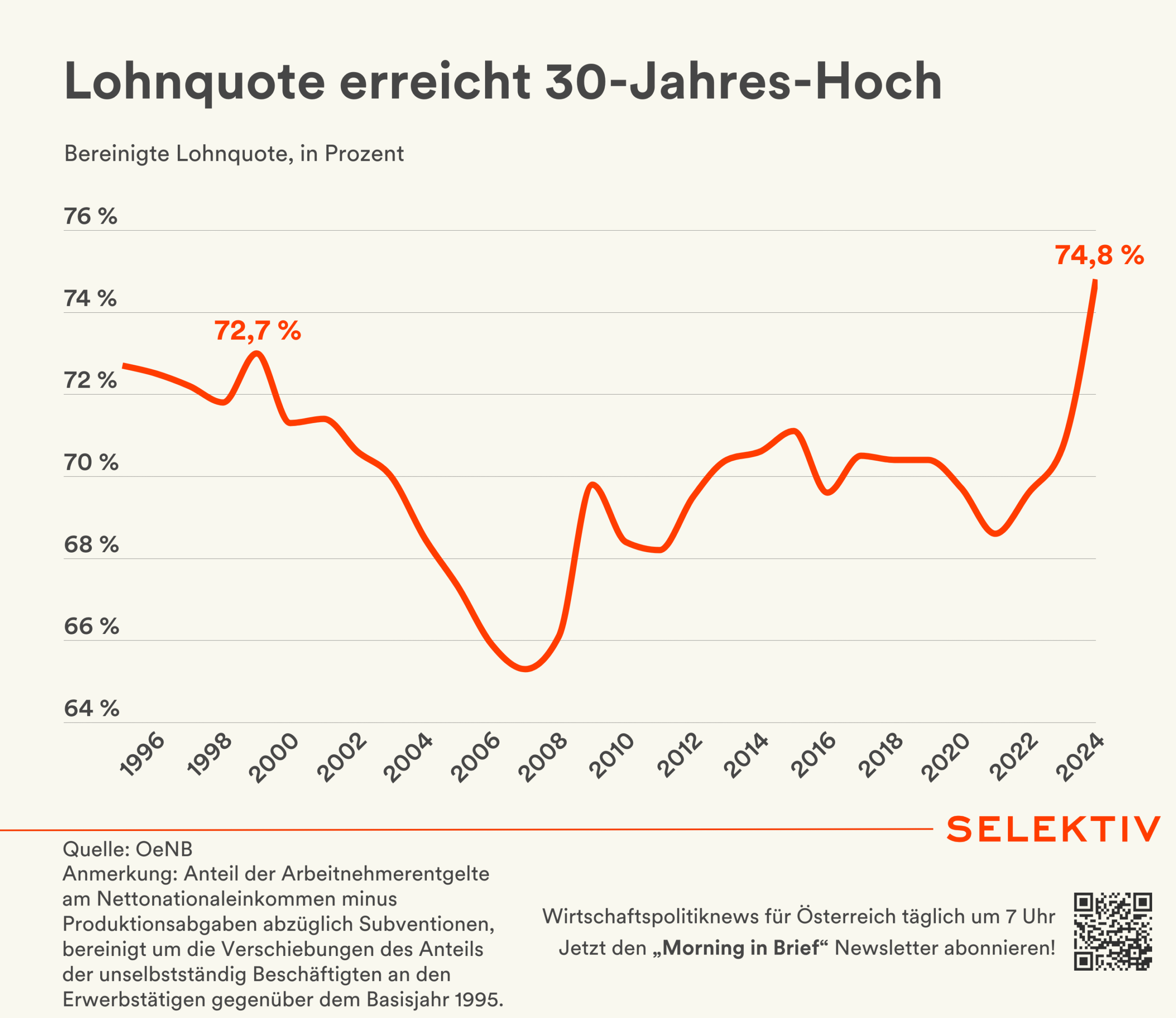 💡 Lohnquote auf Rekordniveau gestiegen. 2024 stieg der Anteil der heimischen Arbeitnehmerentgelte am Nettonationaleinkommen auf einen Rekordwert von 74,8 %. Dies geht vor allem auf in der Krise stark eingebrochene Betriebsüberschüsse zurück. Hohe KV-Abschlüsse sicherten die Kaufkraft der Löhne – während Unternehmen in der Rezession Verluste hinnehmen mussten. [Quelle: OeNB | Grafik von Christoph Hofer]