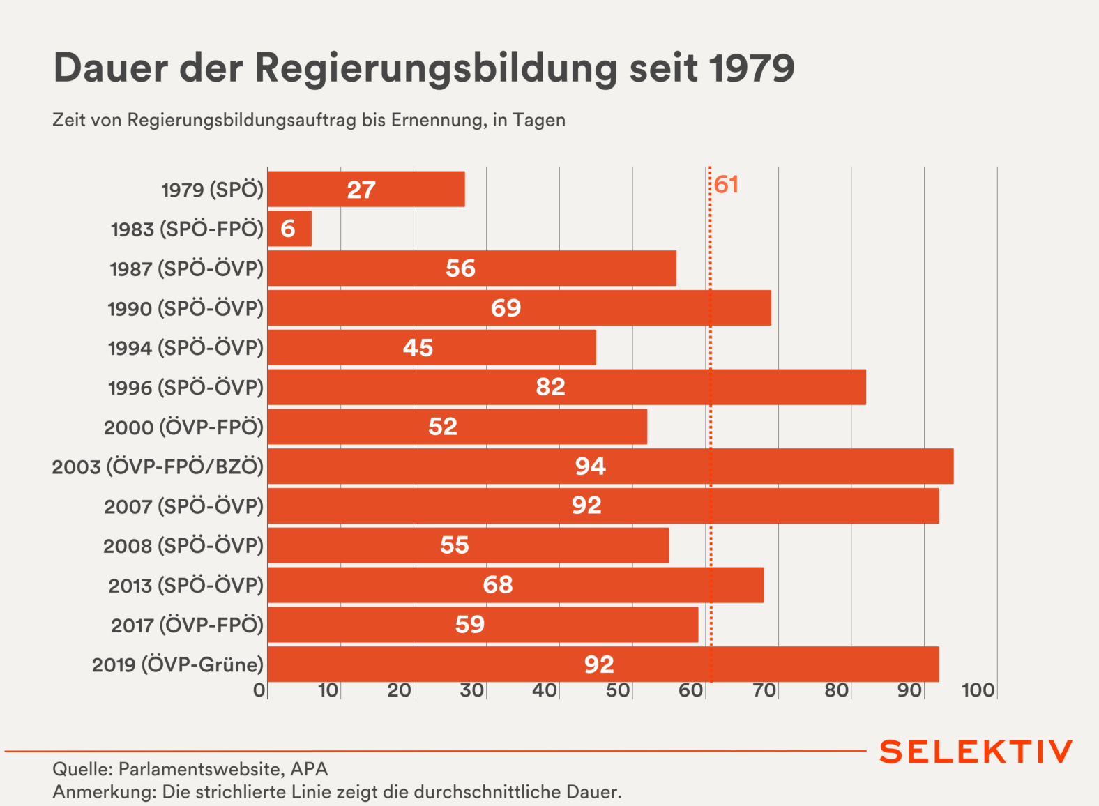 Grafik. Nach der Wahl ist vor den Verhandlungen. 61,3 Tage dauerte es in Österreich seit 1979 im Schnitt von Regierungsauftrag durch den Bundespräsidenten bis zur Angelobung der neuen Bundesregierung. Zuletzt verhandelten ÖVP und Grüne 92 Tage (2019).
