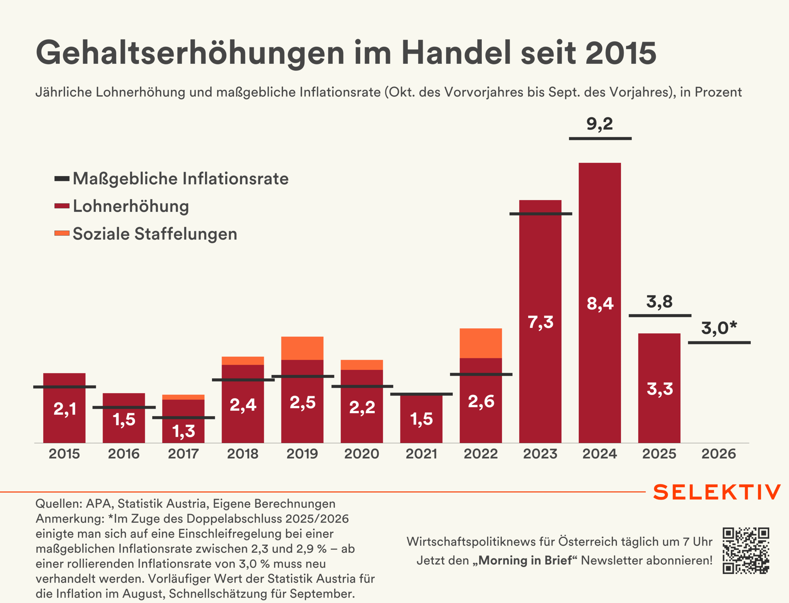 🇦🇹 KV-Handel: Gewerkschaft fordert „Kaufkraftsicherung“. Zwar will die Gewerkschaft der Privatangestellten (GPA) im Vorfeld der KV-Verhandlungen keine konkrete Prozentzahl als Zielwert nennen, sie fordert aber jedenfalls „einen Beitrag zur Kaufkraftsicherung“. Die den Verhandlungen zugrunde liegende Inflationsrate beträgt 3,01 %. Gewerkschaftsvertreter stehen einem neuen Zweijahresabschluss kritisch gegenüber, ein gestaffelter KV-Abschluss sei zwar möglich aber nicht die Idealvorstellung. Einmalzahlungen lehnt die Gewerkschaft ab. Arbeitgeber-Chefverhandler Rainer Trefelik sieht zwar eine gute Gesprächsbasis mit der Gewerkschaft, dämpft aber die Erwartungen auf einen schnellen Abschluss. Die 1. Verhandlungsrunde findet am 6. November statt. [Quelle: APA via Medienberichte | Grafik: Gehaltserhöhungen im Handel seit 2015]