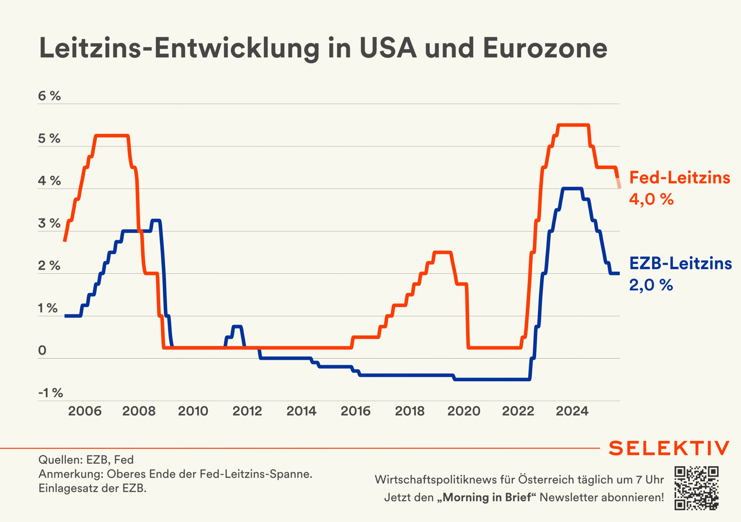 🇪🇺 EZB-Leitzins bleibt unverändert – digitaler Euro ab 2029 geplant. Die Zentralbank belässt die Zinssätze für Einlagefazilität, Hauptrefinanzierungssatz und Spitzenrefinanzierungssatz zum 3. Mal in Folge unverändert bei 2,0 %, 2,15 % bzw. 2,4 %. Mit einer jährlichen Inflationsrate von 2,2 % im September liegt die Teuerung nahe am EZB-Zielwert von 2,0 %, und die Notenbank rechnet damit, dass sie sich mittelfristig weiter in diese Richtung bewegt. Außerdem wurde beschlossen, in die nächste Phase der Einführung des digitalen Euros überzugehen. 2026 sollen die diesbezüglichen Rechtsvorschriften in Kraft treten, 2027 ein Pilotprojekt starten und 2029 das Eurosystem bereit für eine mögliche Erstausgabe sein. [Quellen: EZB I, EZB II, EZB Press Conference | Grafik: Leitzins-Entwicklung in USA und Eurozone]