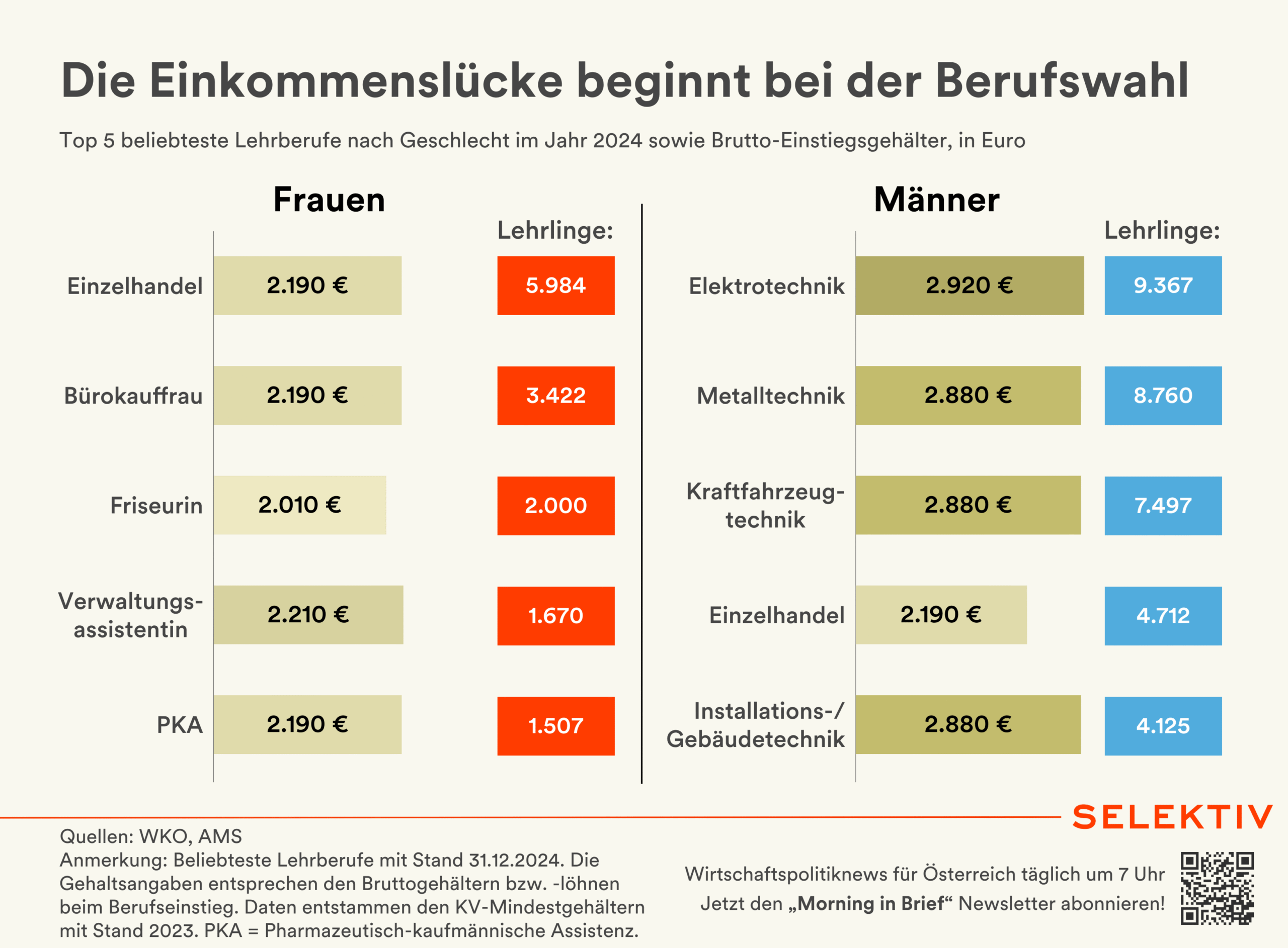 💡 Gender Pay Gap: Berufswahl prägt Gehaltslücke. Die Brutto-Einstiegsgehälter in den fünf beliebtesten Lehrberufen für Männer lagen auch 2024 deutlich höher als in den Top-Berufen für Frauen. Laut AMS-Gehaltskompass können Elektrotechniker mit mindestens 2.920 Euro rechnen, während der weiblich dominierte Einzelhandel nur 2.190 Euro bietet. Zu den beliebtesten Männerberufen zählen zudem Metalltechnik, Kraftfahrzeugtechnik sowie Installations- und Gebäudetechnik. Frauen erreichen hingegen als Bürokauffrau, Friseurin, Verwaltungsassistentin oder PKA maximal 2.210 Euro Einstiegsgehalt. Dies spiegelt sich neben anderem im Equal Pay Day wider, der dieses Jahr auf den 2. November fällt: Laut Statistik Austria verdienten vollzeitbeschäftigte Männer im Jahr 2023 im Schnitt 63.451 Euro brutto jährlich, Frauen 53.128 Euro – ein Unterschied von 16,3 % bzw. rund 60 Tagen. [Quellen: WKO I, WKO II, AMS Gehaltskompass, AMS Equal Pay Day, Agenda Austria | Grafik von Christoph Hofer]