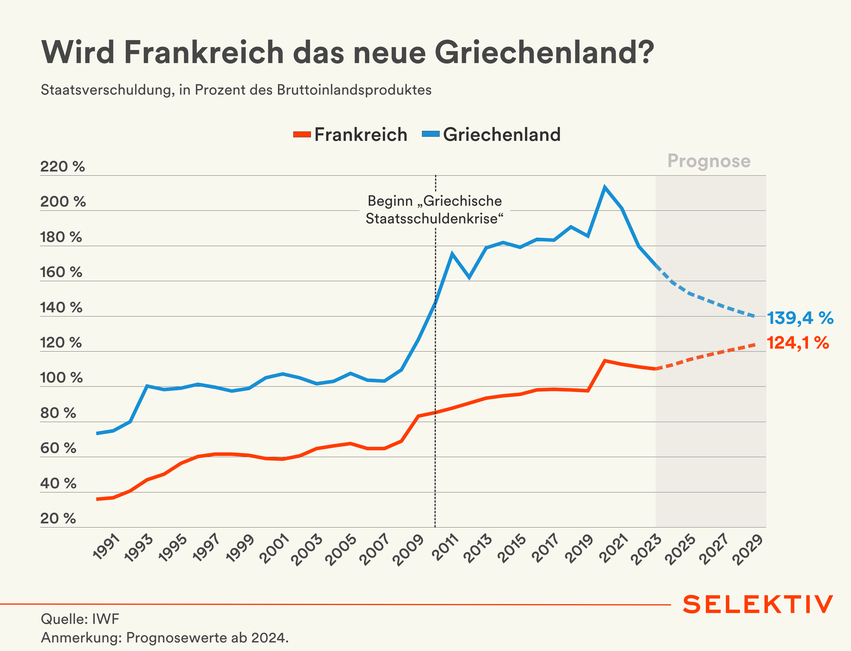 Grafik (von Christoph Hofer): Frankreichs steigende Staatsverschuldung und innenpolitischen Turbulenzen führen zu wachsenden Sorgen auf den Finanzmärkten. Erst kürzlich sanken die Refinanzierungskosten 10-jähriger griechischer Staatsanleihen unter jene französischer. Mittelfristig prognostiziert der Internationale Währungsfonds einen Anstieg der französischen Staatsverschuldung auf 124,1 Prozent des BIP bis 2029. [Quelle: Financial Times]