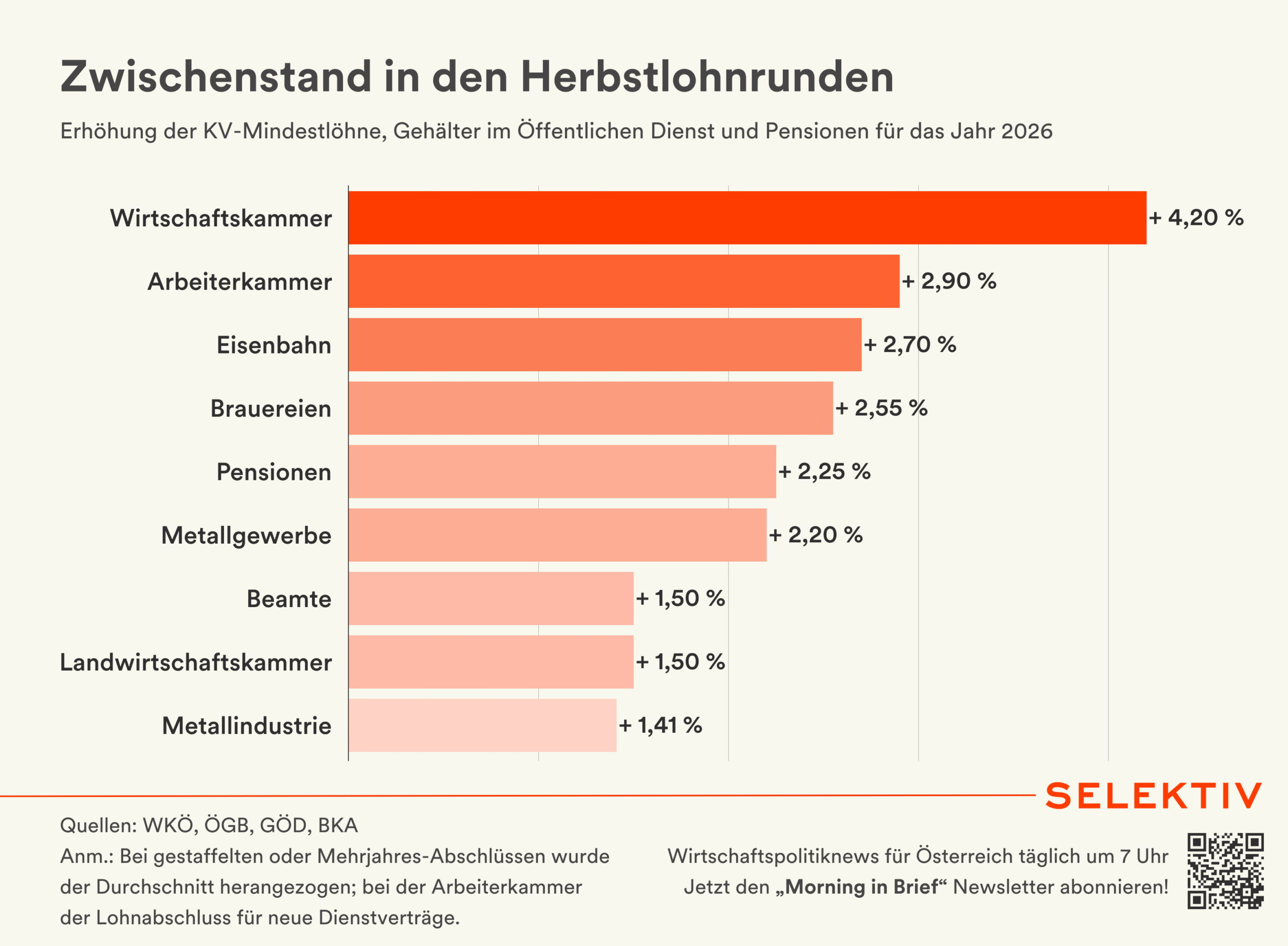 🇦🇹 Wirtschaftskammer erhöht Löhne um 4,2 %. Die Mitarbeiter der Wirtschaftskammer (WKÖ) bekommen ab 2026 eine Lohnerhöhung von 4,2 %, wie die Presse erfuhr. Dass der Abschluss deutlich über der für heuer prognostizierten Inflationsrate von 3,5 % liegt, ergibt sich nicht aus Verhandlungen, sondern aus einer Formel, die sich an der Erhöhung aus dem Vorjahr orientiert. Niedrigere Lohnabschlüsse wie in anderen Branchen werde es demnach erst ab 2027 geben. Nach heftiger Kritik forderte die WKÖ ein Ende des „populistischen Hick-Hacks“: Ihre Gehaltsanpassungen würden im langjährigen Vergleich deutlich unter öffentlichem Dienst und Privatwirtschaft liegen. Die Arbeiterkammer (AK) erhöht die Löhne um 2,7 % (alte Dienstverträge) bzw. 2,9 % (neue DV), während die Landwirtschaftskammer den Beamtenabschluss (im Schnitt +1,5 %) übernimmt. Noch diese Woche beginnen die Neuverhandlungen zu den Kollektivverträgen im Handel. [Quellen: Die Presse, WKÖ | Reaktionen: ÖGB, Neos, FPÖ, Grüne, IV Wien, Initiative #zusammenstärker | Grafik von Stephan Frank]