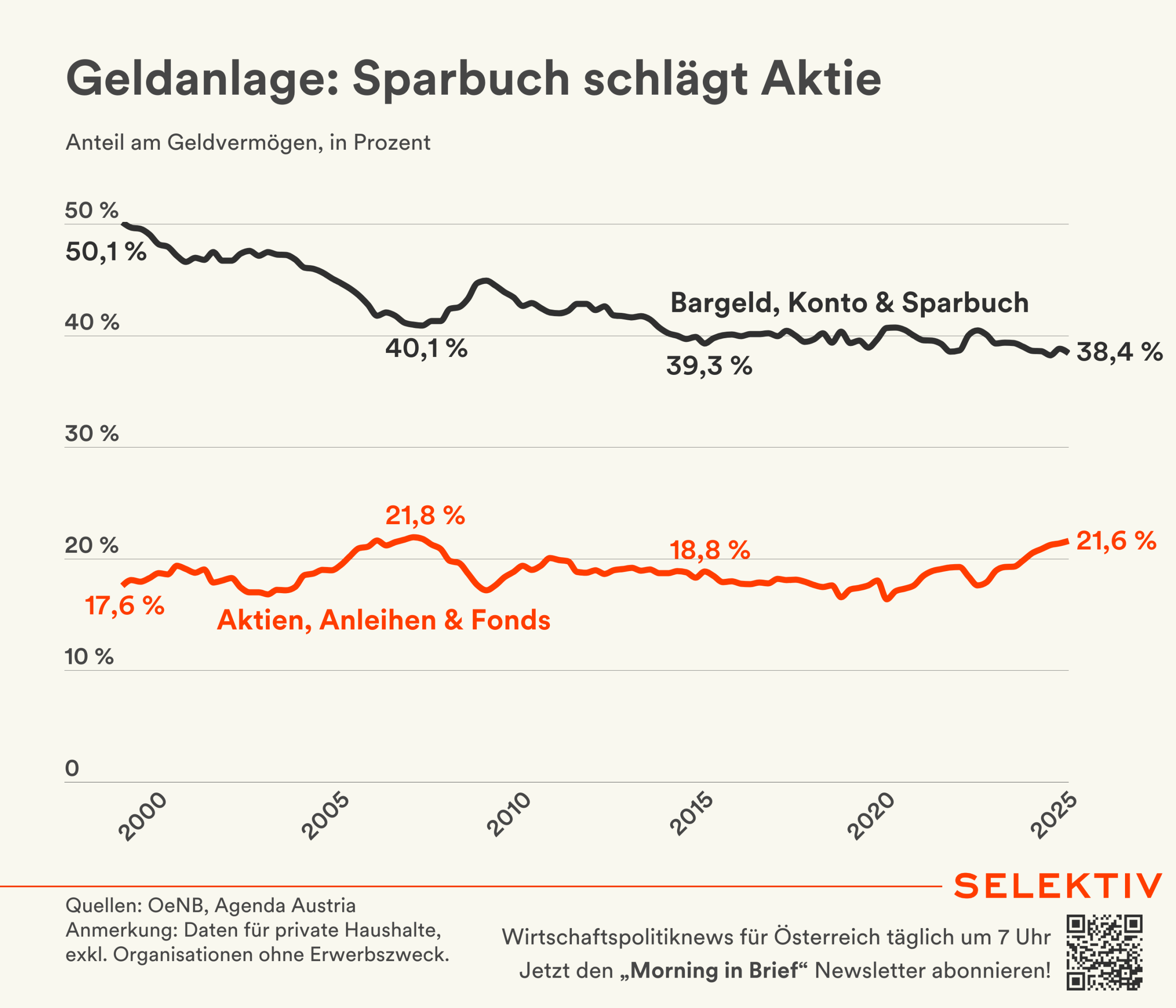 🇦🇹 Österreicher sparen wie in Krisenzeiten. Die heimischen Haushalte haben im Jahr 2024 mit 29,5 Mrd. Euro so viel Geld finanziell veranlagt wie noch nie – dieses floss v. a. in gebundene Einlagen und Wertpapiere, so das Ergebnis der OeNB-Studie „Household Finance and Consumption Survey (HFCS)“. Die Sparquote stieg auf 11,7 % und lag damit deutlich über dem Euroraum-Durchschnitt von 8,4 %. An der relativen Nettovermögensverteilung änderte sich nichts. Rund die Hälfte der Haushalte lebt in einem Eigenheim, Aktien (6 %) und Anleihen (3 %) besitzen hingegen weiterhin nur wenige. Erstmals abgefragt wurde die Verbreitung von Kryptowährungen. Rund 3,9 % der Haushalte besitzen Krypto-Assets mit einem Medianwert von etwa 3.000 Euro – 43 % hiervon machten Bitcoin aus. Die Kreditverschuldung nahm 2025 erstmals seit 2 Jahren wieder zu und lag im Q3 2025 bei +0,5 %. [Quelle: OeNB | Grafik: Geldanlage: Sparbuch schlägt Aktie]