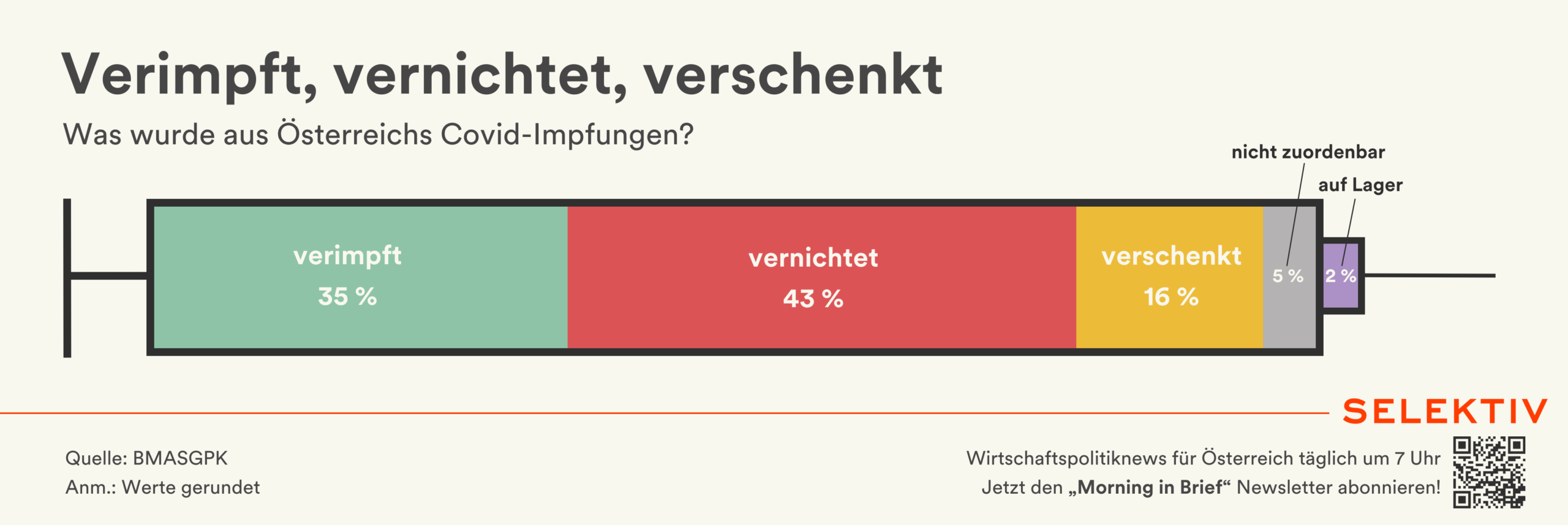 💡 Mehr Covid-Impfungen vernichtet als verwendet. Bis Ende Juni 2025 wurden 62,1 Mio. Covid-Impfdosen nach Österreich geliefert. Davon wurden 21,7 Mio. bzw. 35 % verimpft, während 26,6 Mio. bzw. 43 % vernichtet wurden. Weitere 9,8 Mio. Impfungen wurden an andere Länder gespendet, rund 1 Mio. befindet sich noch auf Lager. Die restlichen rund 3 Mio. Impfdosen sind nicht klar zuordenbar. Diese könnten zum Teil im Rahmen betrieblicher oder mobiler Impfungen verwendet worden sein, sich noch dezentral auf Lager befinden oder bereits verworfen worden sein, erklärt ein Sprecher des Gesundheitsministeriums auf Selektiv-Anfrage. [Quellen: parl. Anfragebeantwortung des BMASGPK, Bericht gem. § 3 Abs. 5 COVID-19-FondsG | Grafik von Stephan Frank]