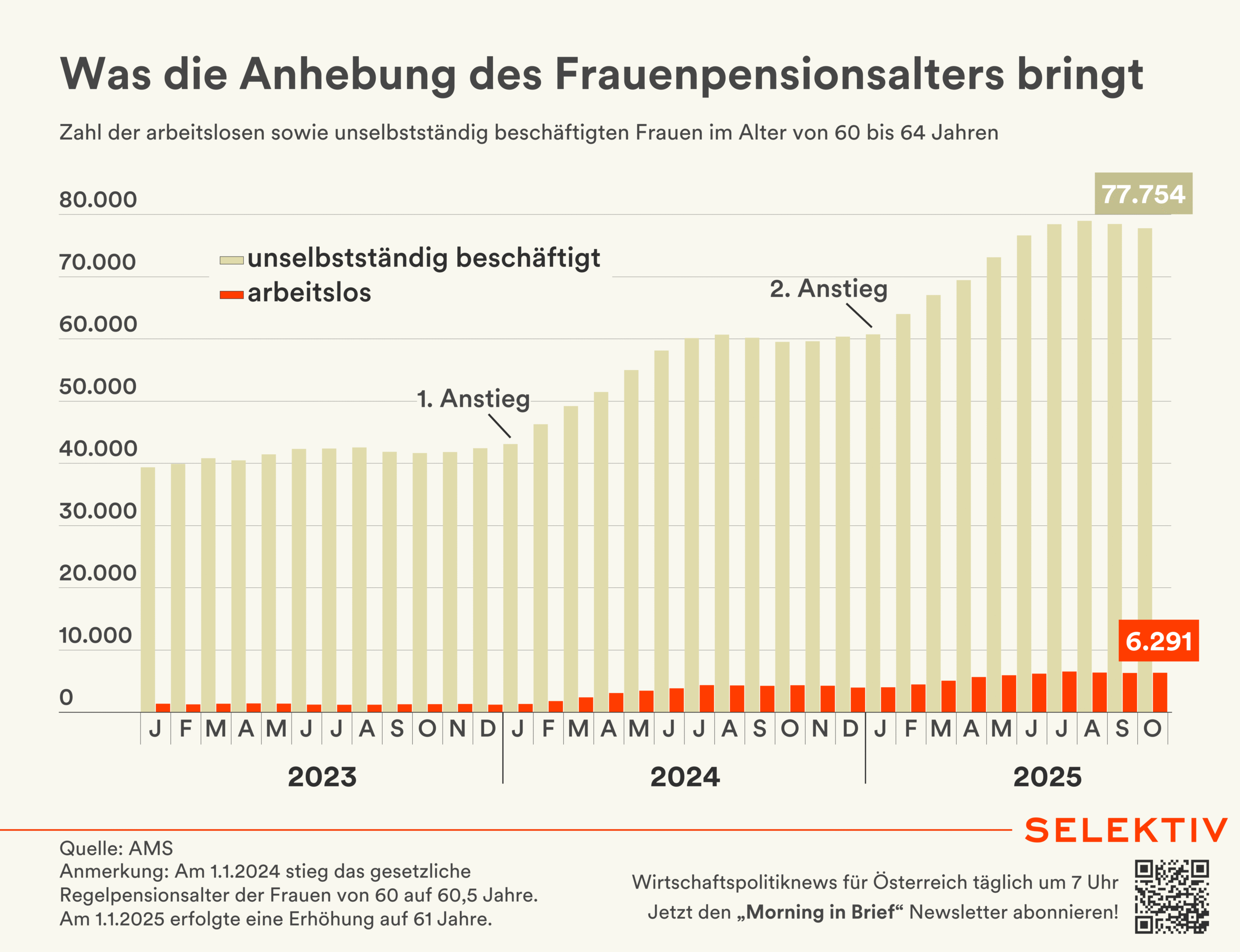 🇦🇹 Teilzeitquote der Frauen fällt unter 50 %. Im 3. Quartal lag die Teilzeitquote bei Frauen in Österreich bei 49,1 % und damit um 1,7 Prozentpunkte niedriger als im Vorjahreszeitraum. Laut Statistik Austria geht das vor allem auf die Verschiebung von Stellen im Handel hin zu Stellen im öffentlichen Dienst zurück. Bei Männern stieg die Teilzeitquote um 0,6 Prozentpunkte auf 14 %. Gleichzeitig ist die Zahl der Erwerbstätigen unter Frauen zwischen 55 und 64 um 4,7 Prozentpunkte gestiegen – Hintergrund ist die schrittweise Anhebung des Pensionsantrittsalters bei Frauen. Im internationalen Vergleich sei die Erwerbsbeteiligung mit 56,8 % bei Frauen in dieser Altersgruppe noch immer niedrig, so die Statistik Austria. [Quelle: Statistik Austria | Grafik: Was die Anhebung des Frauenpensionsalters bringt]