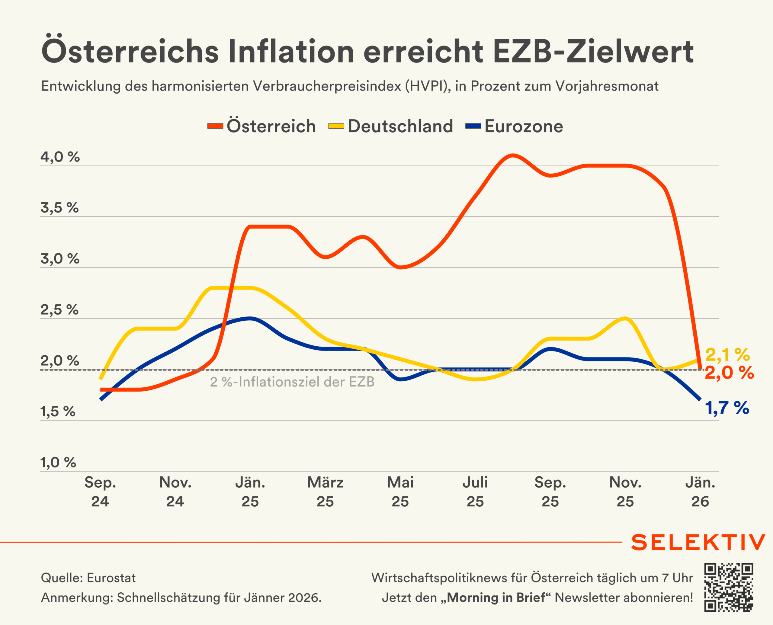🇦🇹 Inflation sinkt auf 2,0 %. Die Inflationsrate für Jänner 2026 liegt laut Schnellschätzung der Statistik Austria bei 2,0 %. Der für den EU-Vergleich relevante HVPI liegt ebenfalls bei 2,0 %. Gegenüber dem Vormonat ist das Preisniveau um 0,7 % (VPI) bzw. 0,8 % (HVPI) gesunken. Im Bereich Energie sanken die Preise im Jahresabstand um 4,9 %, u. a. aufgrund des Wegfallens des Basiseffekts der ausgelaufenen Strompreisbremse sowie der für heuer gesenkten Energieabgabe und des reduzierten Erneuerbaren-Förderbeitrags. Teuerungstreiber waren weiterhin die Dienstleistungen (+3,8 %). Nahrungsmittel, Tabak und Alkohol verteuerten sich um 2,7 %, Industriegüter um 0,8 %. Die Kerninflation lag im Jänner bei 2,8 %. In der Eurozone ist die Inflation im Jänner 2026 auf 1,7 % (HVPI) gesunken, auch hier dämpften Energiepreise (-4,1 %) die Preisentwicklung, während Dienstleistungen (+3,2 %) preistreibend wirkten. [Quellen: Statistik Austria, Eurostat | Reaktionen: BMWET, ÖVP, SPÖ, FPÖ (Kassegger), FPÖ (Kolm), Grüne, Marterbauer, Handelsverband, ÖGB, PRO-GE | Grafik von Christoph Hofer]