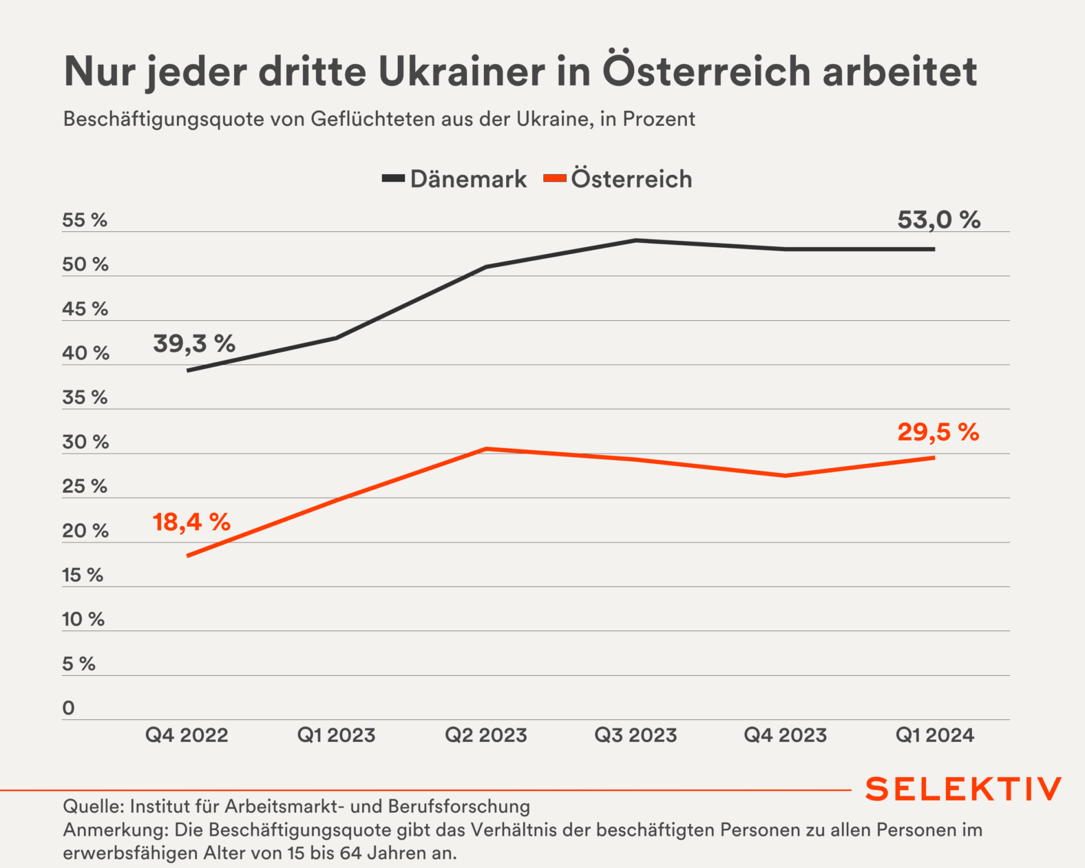 Grafik: Die Beschäftigungsquote von Geflüchteten aus der Ukraine betrug in Österreich im ersten Quartal 2024 29,5 Prozent. Damit liegt man im EU-Schnitt, jedoch deutlich unter Länder wie Polen, den Niederlanden oder Dänemark in denen bereits jeder zweite Ukrainer einer Arbeit nachgeht. Einer der Gründe für diesen Unterschied könnte das heimische System der Grundversorgung sein. In diesem sind Flüchtlinge grundsätzlich nicht an das AMS und damit Bemühungen um eine Beschäftigung gebunden. In der Mindestsicherung (Sozialhilfe) wären sie das.