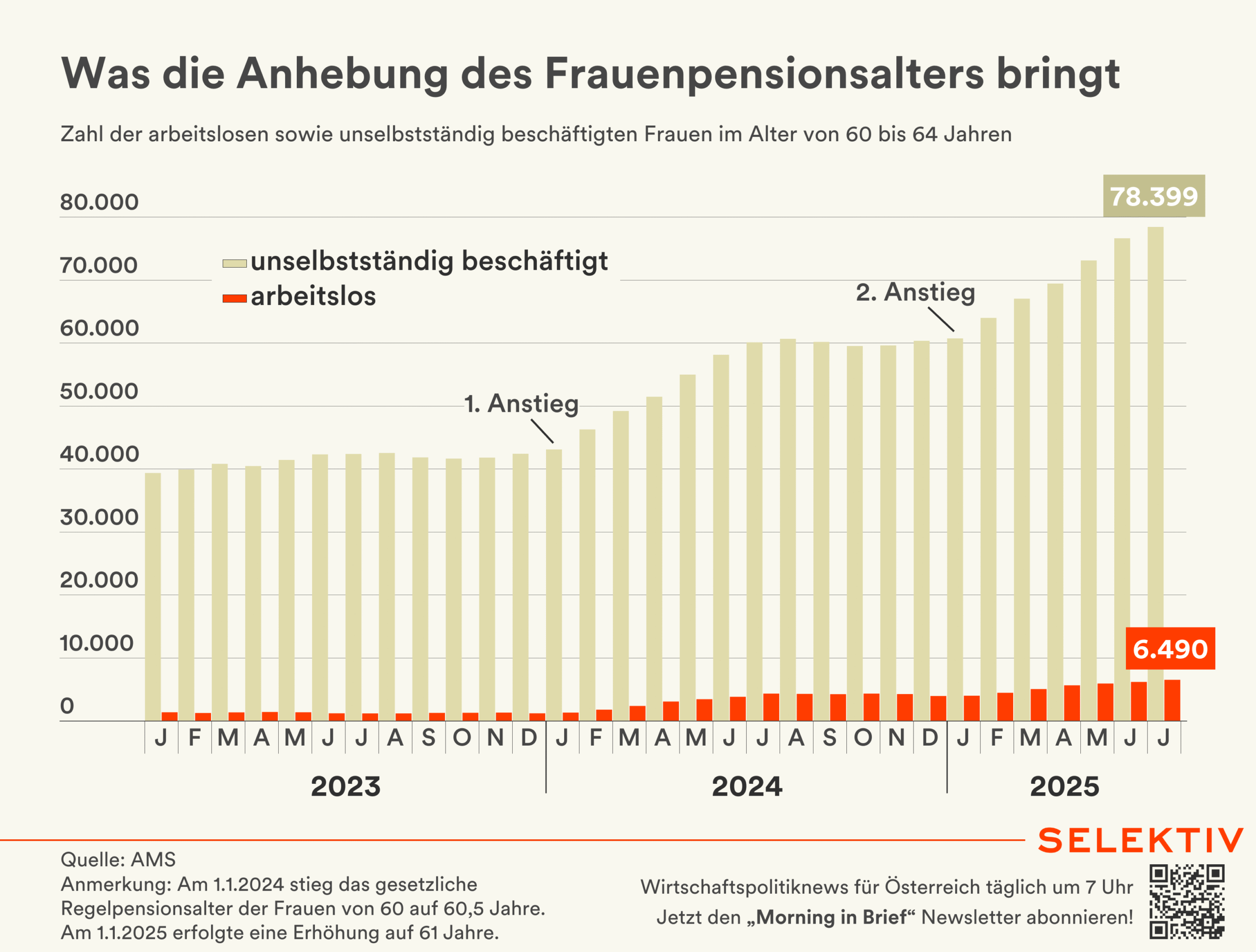 🇦🇹 Mehr Menschen in Vollzeit, weniger in Teilzeit. Die Zahl der Arbeitslosen ist im 2. Quartal 2025 im Jahresabstand um 12,4 % auf 261.100 gestiegen. Es gibt aber auch gute Nachrichten: Die Zahl der Erwerbstätigen ist ebenso gestiegen und besonders kräftig ist die Zahl der Vollzeit arbeitenden Menschen in die Höhe gegangen, während gleichzeitig weniger Menschen in Teilzeit arbeiten. Die Teilzeitquote ist vor allem bei Frauen zurückgegangen. Auch der Anteil der arbeitenden 55- bis 64-Jährigen hat um 2,2 Prozentpunkte zugenommen. Die Anhebung des Frauenpensionsalters sorgt bei arbeitenden 60- bis 64-jährigen Frauen für einen Zuwachs von 7,2 Prozentpunkten. In der Vergleichsgruppe der Männer lag das Plus bei 2,0 Prozentpunkten. Im Vergleich mit anderen Ländern sei die Älterenbeschäftigung in Österreich aber nach wie vor niedrig. [Quelle: Statistik Austria | Grafik: Was die Anhebung des Frauenpensionsalters bringt]