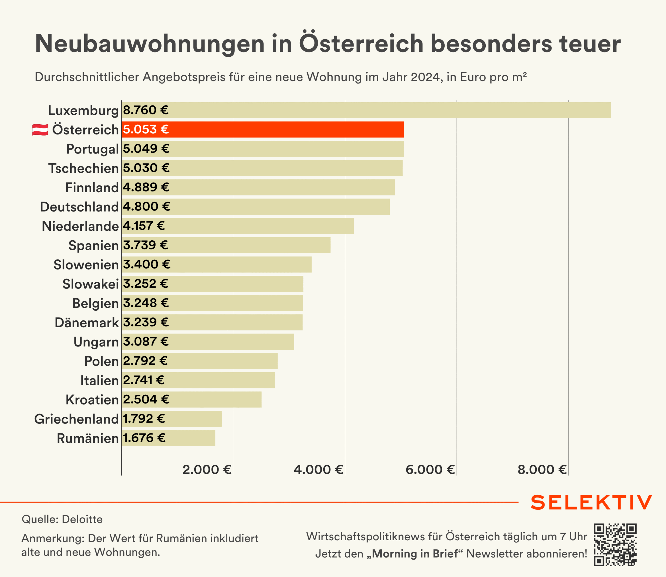 Grafik (von Christoph Hofer und Sara Grasel): Österreich liegt beim Kauf von Neubauwohnungen preislich im europäischen Spitzenfeld. Laut Deloitte-„Property Index 2025“ lag der Durchschnittspreis für freifinanzierte Neubauwohnungen 2024 bei 5.053 Euro pro m² (+2,7 % gegenüber 2023), damit lag Österreich nach Luxemburg (8.760 € /-3,4 %) und dem Vereinigten Königreich (5.203 € /-0,9 %) auf Rang 3 in Europa. Den leichten Preisanstieg in Österreich begründet Deloitte mit der Inflation, höheren Baumaterial-Preisen und weniger Baubewilligungen trotz starker Nachfrage. Einkommenszuwächse und die Lockerung der Geldpolitik hätten den Erwerb von Eigenheimen aber wieder erschwinglicher gemacht. [Quelle: Deloitte Property Index 2025]