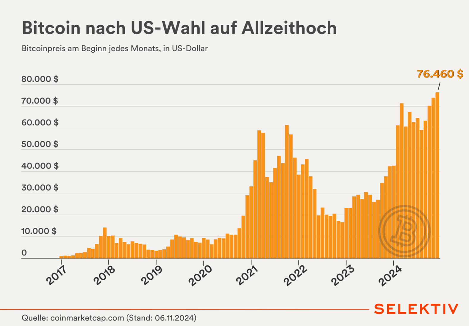 US-Wahlen III: Märkte. Der Sieg Donald Trumps hat dem Dollar den größten Kurssprung seit 2023 beschert – die US-Währung stieg um 1,7 Prozent, der Euro sank auf ein 4-Monats-Tief. Auch Bitcoin reagiert positiv auf die Wahl und erreichte einen neuen Rekordpreis von über 76.000 Dollar. Der Goldpreis gab im Unterschied dazu deutlich nach, an der Londoner Börse sank der Preis für eine Feinunze um 82 Dollar und war damit am tiefsten Wert seit drei Wochen. An den US-Börsen herrscht Euphorie, die europäischen Börsen hingegen schlossen mit Verlusten. [Quellen: Bitcoin-Kurs, Euro-Dollar-Kurs]