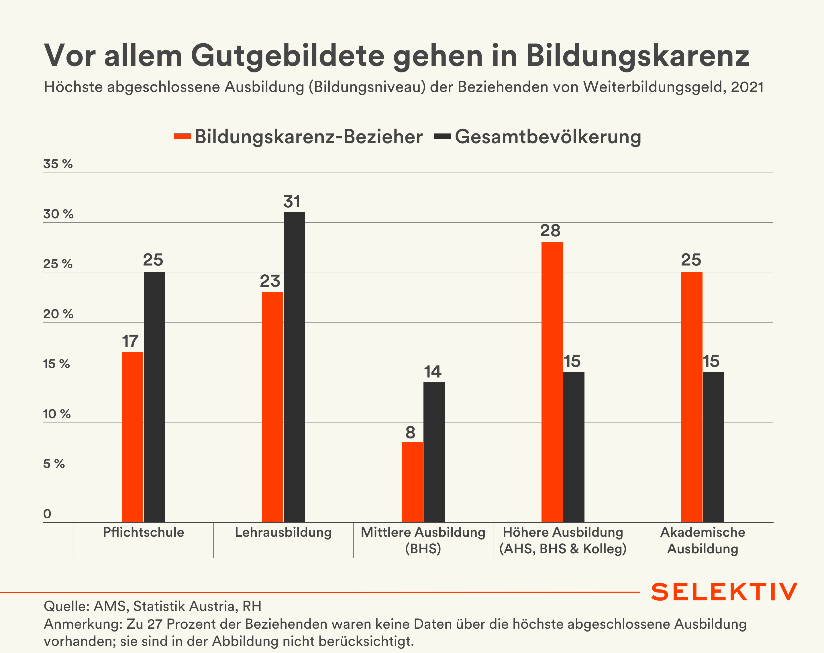 Grafik: Mehr als die Hälfte der Beziehenden von Bildungskarenz haben bereits eine höhere oder akademische Ausbildung abgeschlossen. Der Anteil dieser lag damit deutlich über ihrem Anteil in der Gesamtbevölkerung (30 Prozent). Personen mit Pflichtschul-, Lehr- oder mittlerer Ausbildung nutzen die Bildungskarenz derweil erheblich seltener als ihrem Anteil an der Gesamtbevölkerung entspricht.