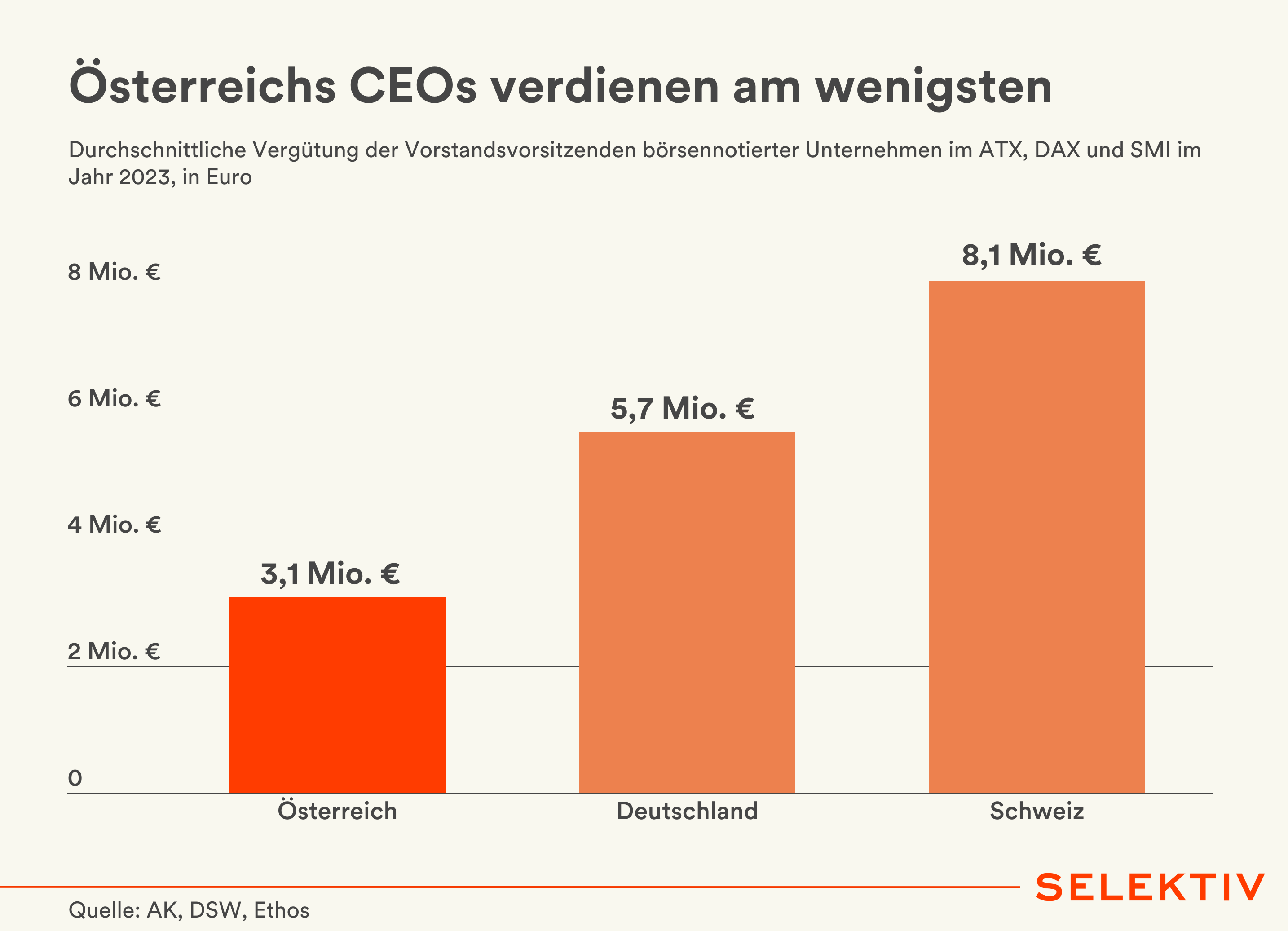 Grafik (von Christoph Hofer): Heute am 8. Jänner ist sogenannter „Fat Cat Day“. Der Tag an dem laut Berechnungen der Arbeiterkammer ein durchschnittlicher Vorstandsvorsitzender in Österreich so viel verdient hat wie ein durchschnittlicher Beschäftigter im gesamten Jahr. Im internationalen Vergleich gehören heimische CEOs nicht zu den Spitzenverdienern. Mit im Schnitt 3,1 Mio. Euro jährlicher Vergütung landen diese 2023 deutlich hinter ihren Kollegen aus Deutschland (5,7 Mio. Euro) sowie der Schweiz (8,1 Mio. Euro). [Quelle: AK, DSW, Ethos]