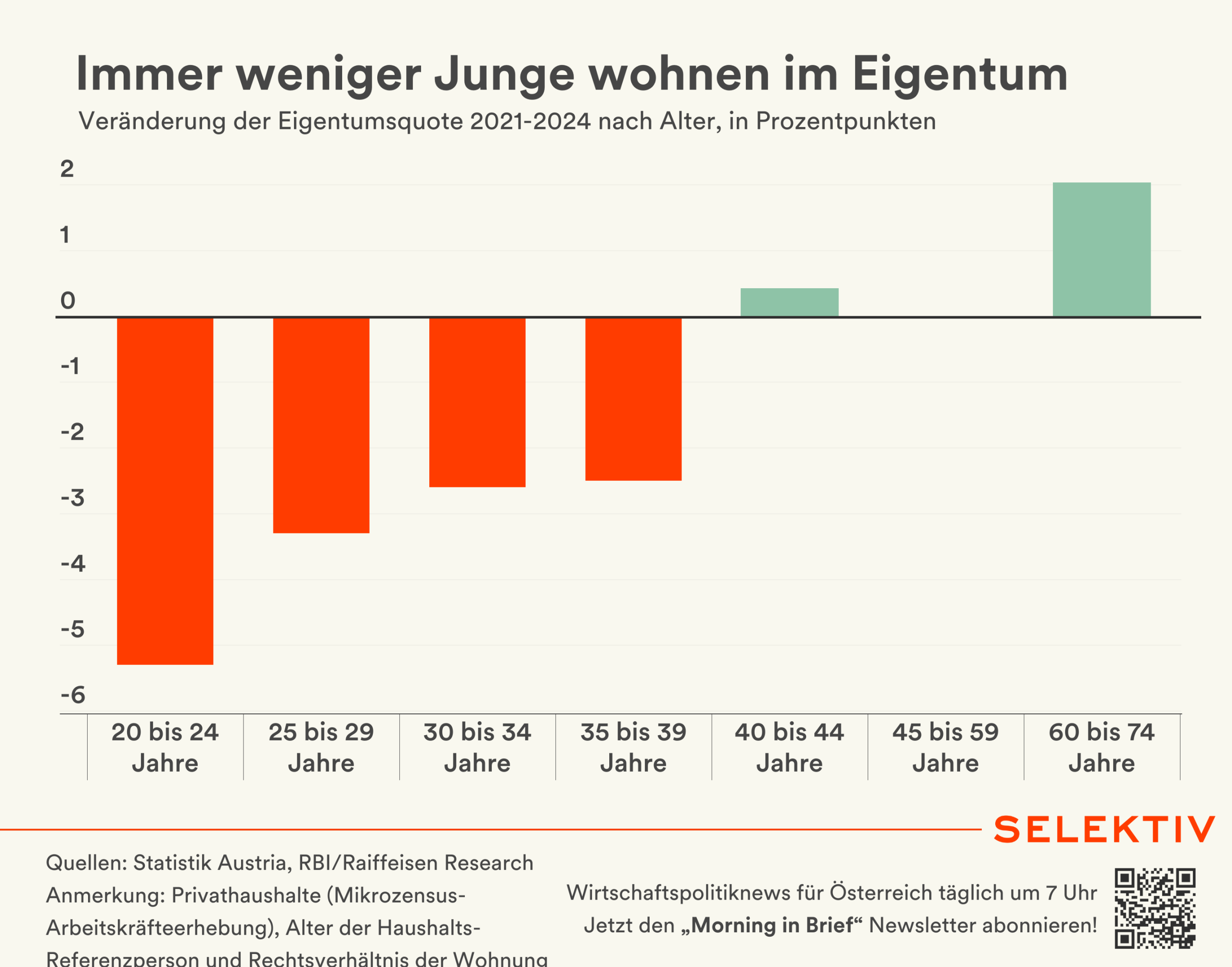Grafik (von Sara Grasel): Junge Menschen haben sich in Österreich in den vergangenen 3 Jahren besonders selten für Wohneigentum entschieden. In der Altersgruppe 20 bis 24 Jahre ist die Eigentumsquote nach Berechnungen von Raiffeisen Research um 5,3 Prozentpunkte zurückgegangen und auch bei 35- bis 39-Jährigen steht noch ein Minus von 2,5 Prozentpunkten. Ab 40 Jahren ändert sich das Bild. „Da die Entscheidung für oder gegen Wohneigentum von Personen im mittleren und fortgeschrittenen Alter bereits (lange) vor Aufkommen des ,doppelten Gegenwinds‘ erfolgt ist, sind diese Personen kaum von Zinswende und KIM-Verordnung betroffen“, erklärt Raiffeisen-Ökonom und Selektiv-Kommentator Matthias Reith.
