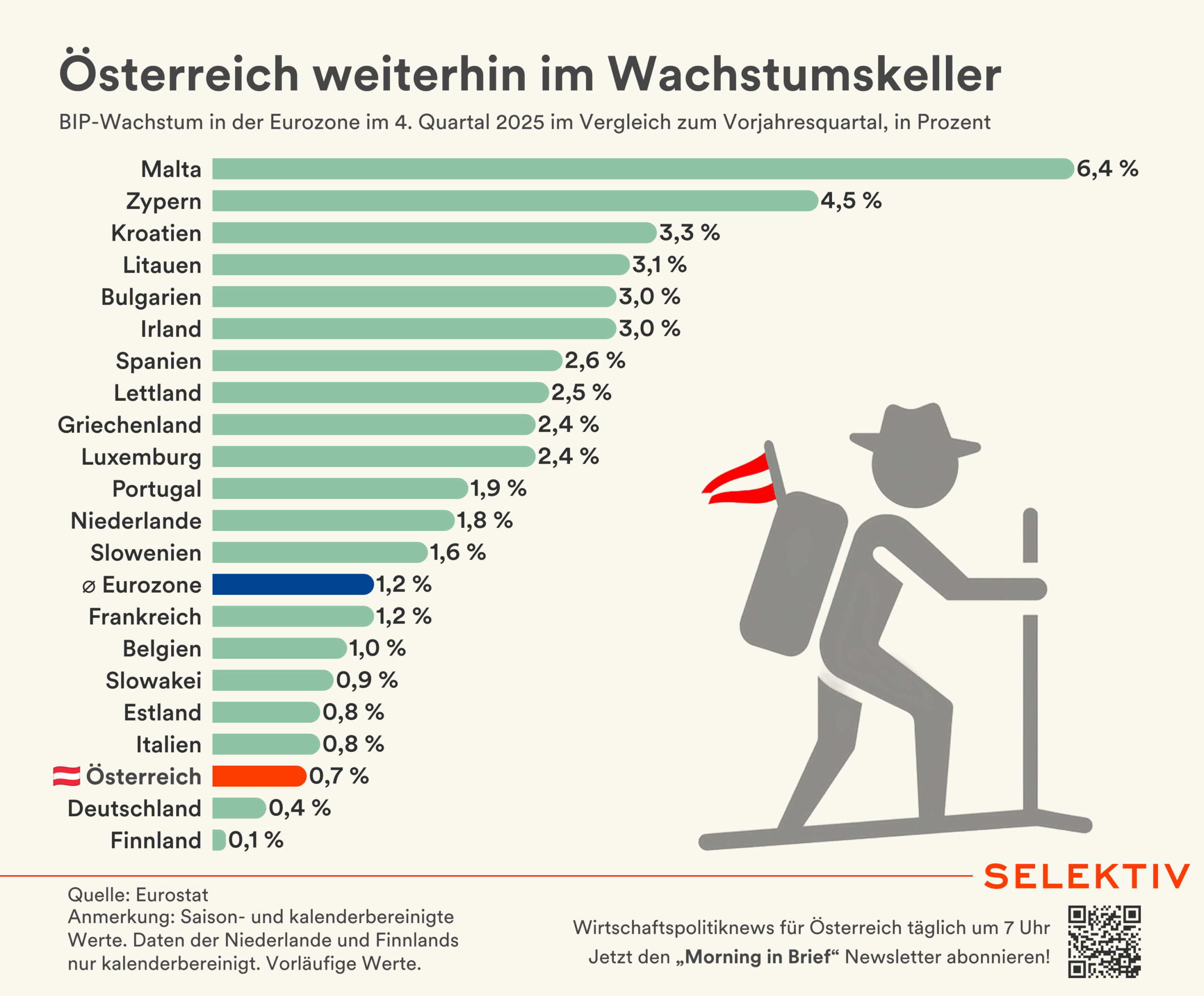💡 Österreich bei Wachstum an drittletzter Stelle in der Eurozone. Im 4. Quartal 2025 ist Österreichs Wirtschaft im Vergleich zum Vorjahresquartal um 0,7 % gewachsen. Gegenüber dem 3. Quartal 2025 ist ein Nullwachstum zu verzeichnen. Im Schnitt wuchs die Eurozone gegenüber dem Vorjahresquartal um 1,2 %. Spitzenreiter ist Malta mit einem deutlichen Wachstum von 6,4 %. Nur Finnland (+0,1 %) und Deutschland (+0,4 %) wuchsen langsamer als Österreich. [Quelle: Eurostat | Grafik von Christoph Hofer]
