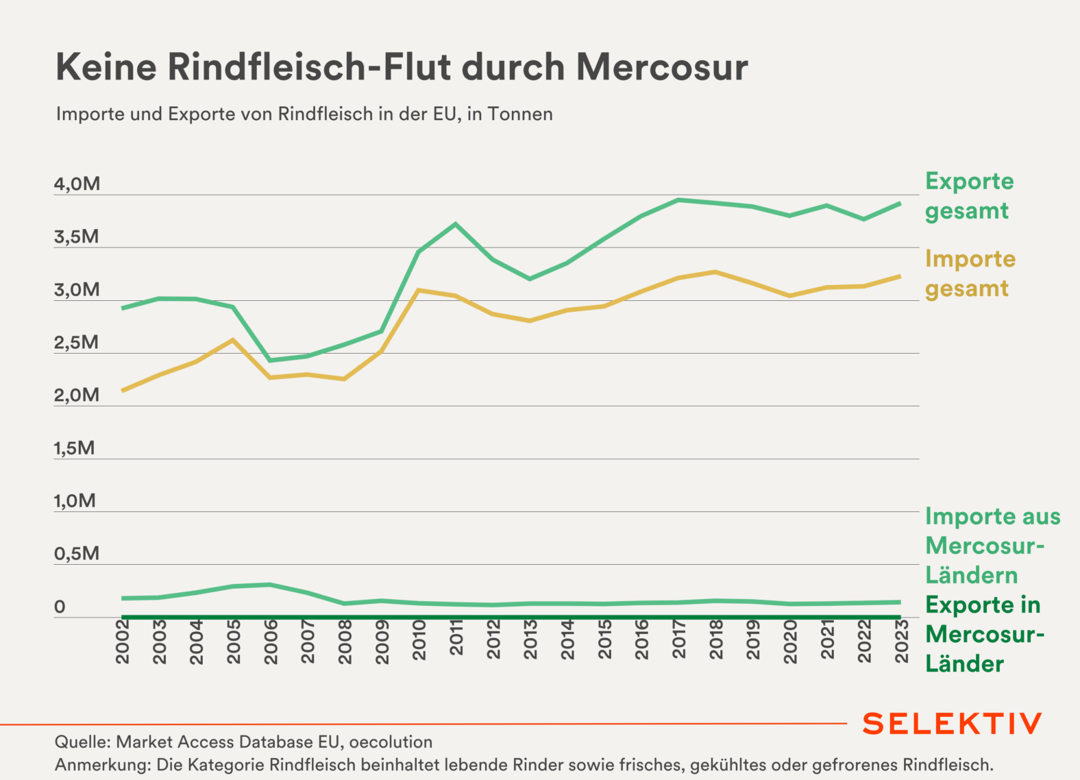 Grafik (von Christoph Hofer): Nur 99.000 Tonnen an Rindfleisch sollen in Zukunft jährlich laut letztem Mercosur-Entwurf zu einem ermäßigten Zoll von 7,5 Prozent importiert werden dürfen. Der Rest würde, wie bisher, einem Zoll von 40 bis 45 Prozent unterliegen. Die begünstigten Importe entsprächen dabei nur gut einem Prozent des europäischen Rindfleischverbrauchs.