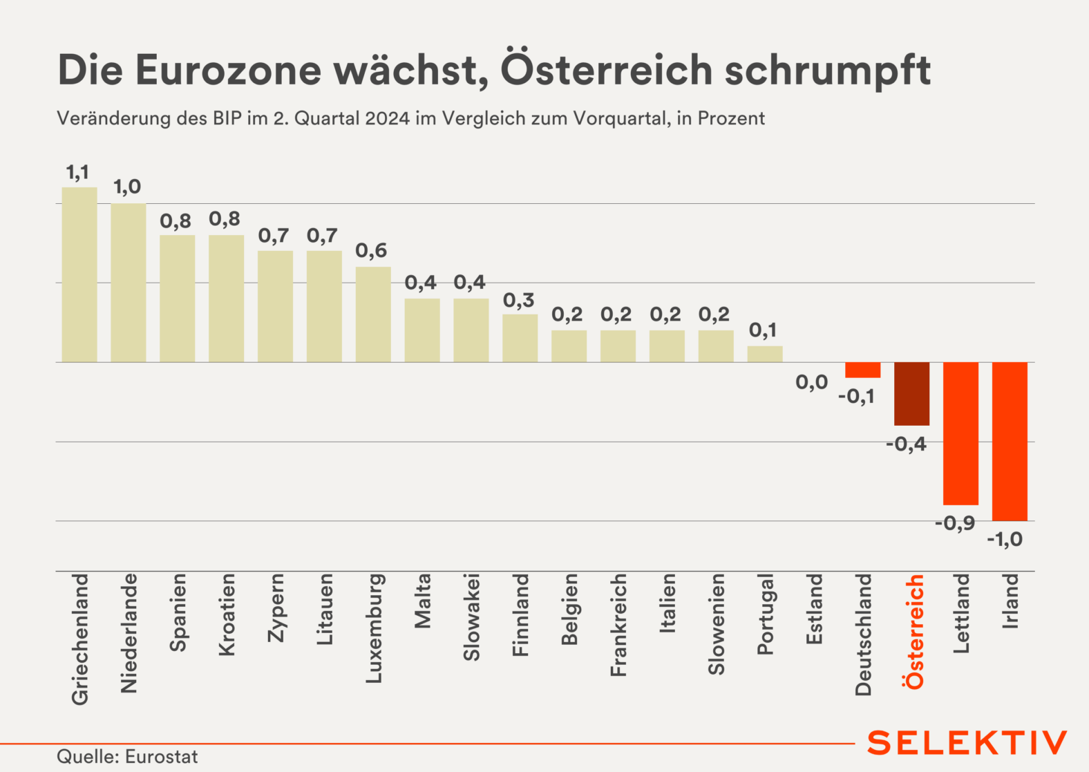 Grafik. Die Wirtschaft ist in der Eurozone im zweiten Quartal 2024 schwächer gewachsen als erwartet. Das BIP stieg im Quartalsvergleich um 0,2 Prozent und im Jahresvergleich um 0,6 Prozent. Österreichs Wirtschaft schrumpfte derweil um 0,4 Prozent im Vergleich zum Vorquartal und um 0,6 Prozent im Jahresvergleich. [Quelle: Eurostat]