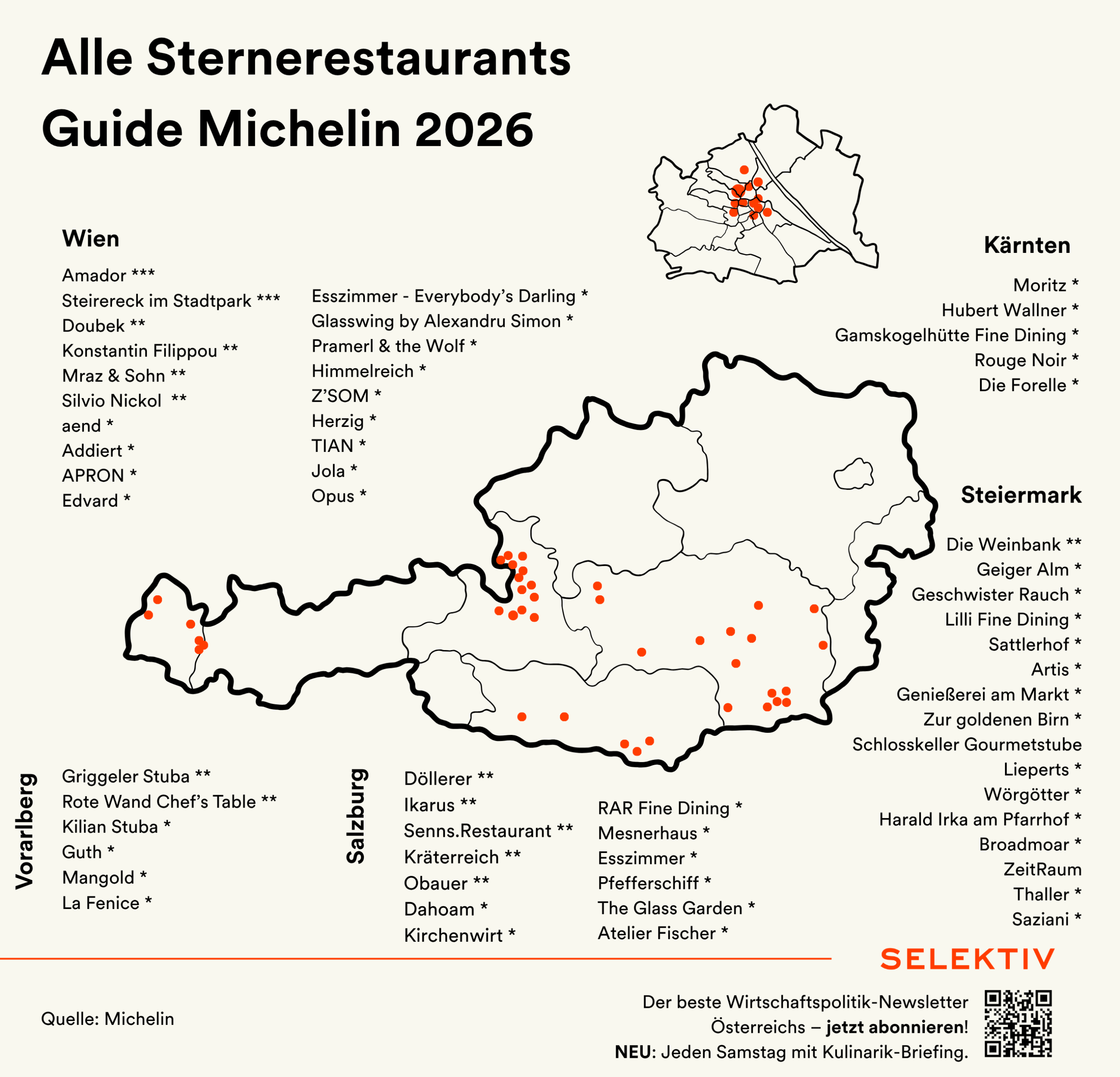 Diesen Mittwoch wurde die neue Sterne-Selektion des Guide Michelin Österreich 2026 präsentiert. 101 Sternerestaurants zählt das Land nun insgesamt – Platz drei weltweit pro Kopf, hinter der Schweiz und Luxemburg. Ähnlich erfolgreich ist Österreich nur noch in der Industrie – auch hier belegt die Alpenrepublik Platz 3 bei den Weltmarktführern in Relation zur Bevölkerung. Jedenfalls ein voller Erfolg für den (Gourmet-) Standort.