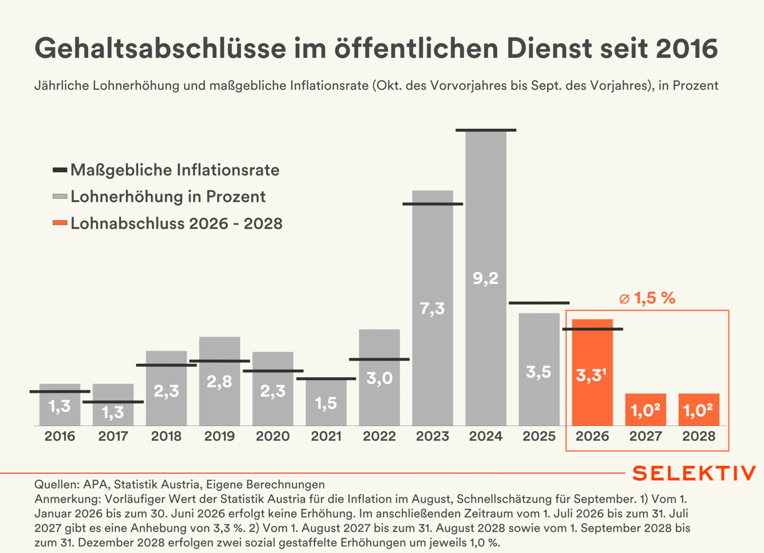 Aufgrund des neuen Gehaltsabschlusses werden die Beamten bis 2028 Einbußen in Höhe von rund 11 Milliarden Euro verzeichnen im Vergleich zu einer regulären Inflationsanpassung. Auch die Metaller müssen deutliche Verlusten hinnehmen. Pensionisten werden 2026 hingegen lediglich auf 350 Millionen Euro verzichten müssen. Ist der Beitrag der Pensionisten zur Budgetsanierung im Verhältnis nicht deutlich zu niedrig?